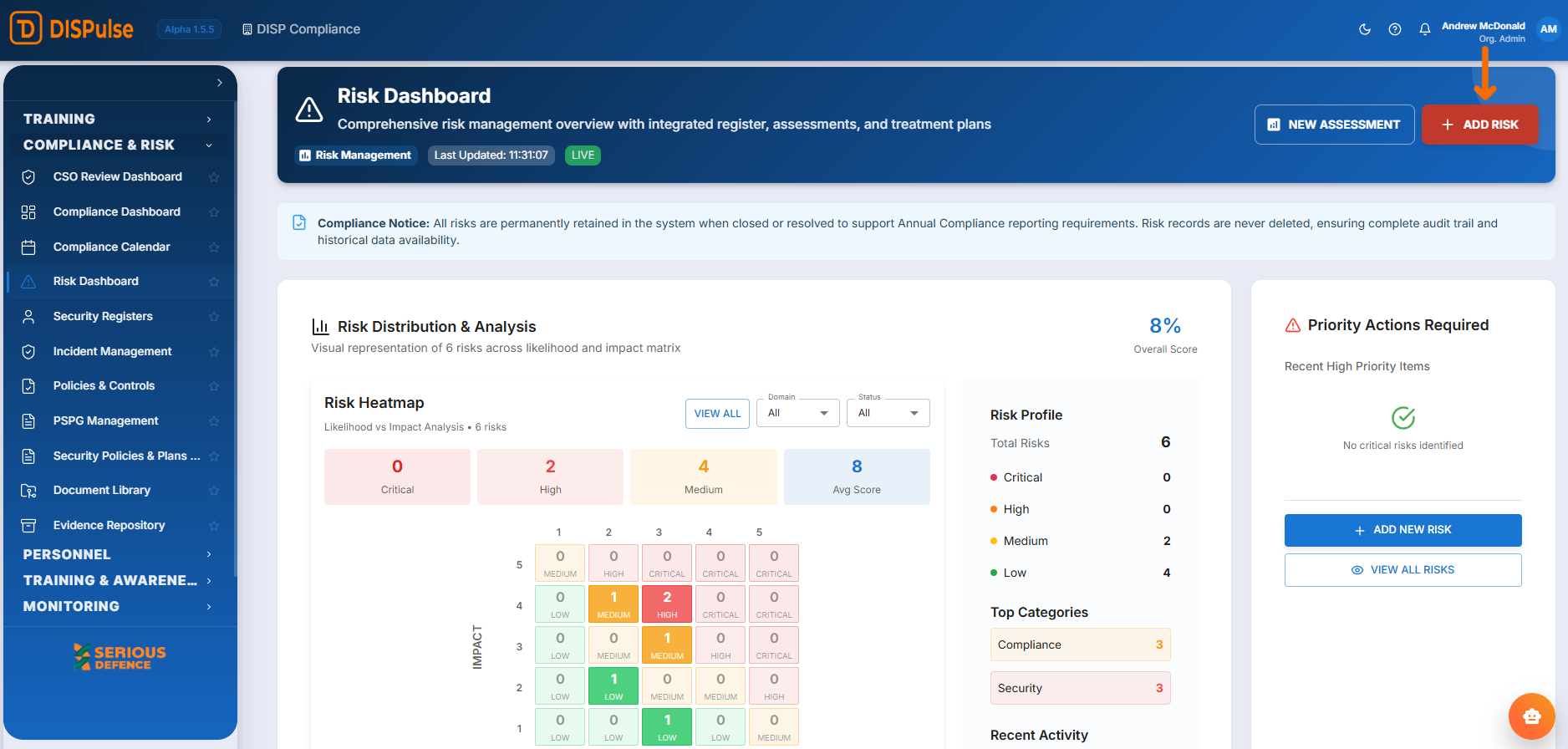 Managing risks has never been easier, thanks to DISPulse. To get started with adding your first risk in DISPulse, navigate to the Risk Dashboard.