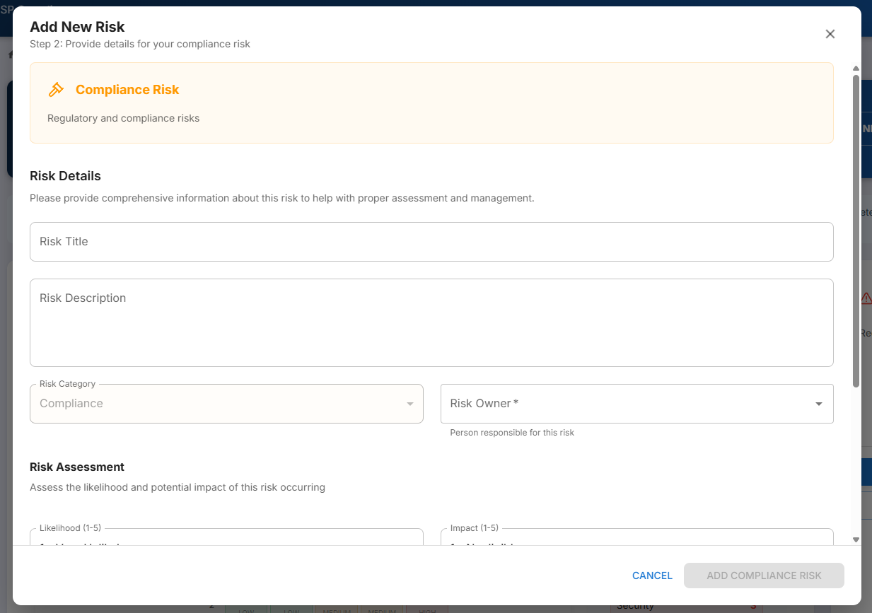 Once you’ve selected the category, you’ll need to fill in the details of the risk you wish to create. Start from the beginning and ensure you capture all relevant information about the risk.