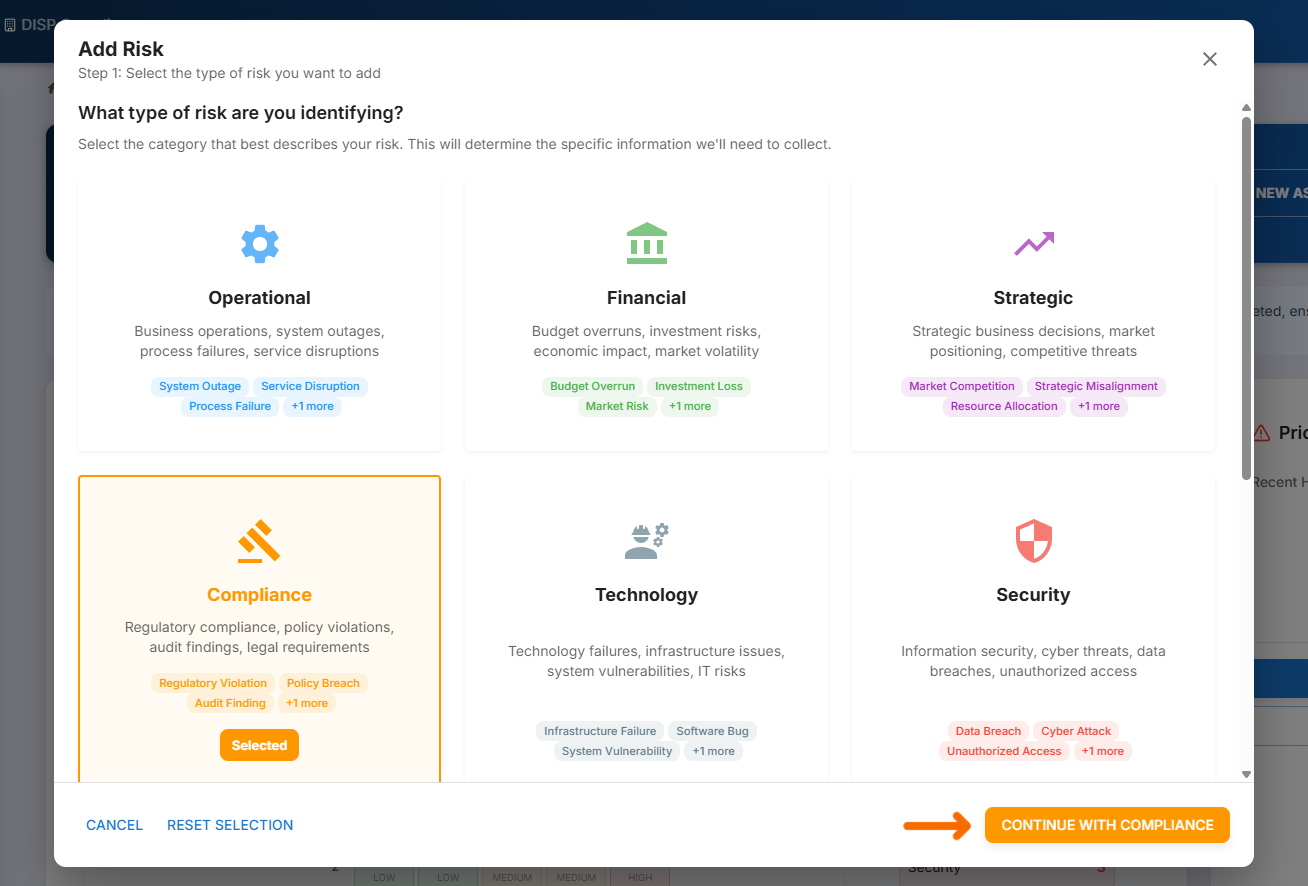 Identify which risk category applies to the risk you wish to create. Once you’ve identified the risk category, select it and then click‘ CONTINUE WITH SELECTED TYPE’.