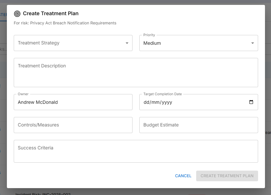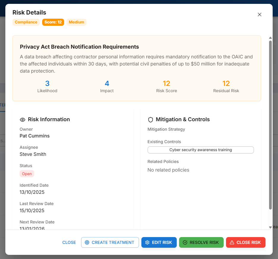 Now we can apply any treatment, mitigation plans, or strategies you have in place for the risk we’ve just added. To do so, either click the ‘TREAT’ in the ‘Actions’ column in the risk register for the risk you’ve just created or open the risk's details card and click ‘CREATE TREATMENT’ from the bottom of the card. Once done, a new form will open, allowing you to create a treatment plan for the risk you selected. You can confirm you selected the correct risk at the top of the form.