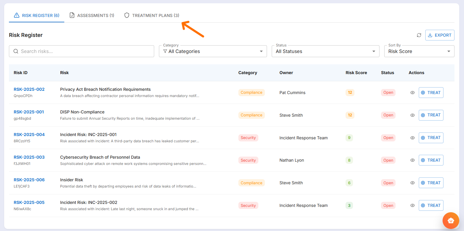 For each risk you create, there are two actions: View Risk Details and TREAT.
